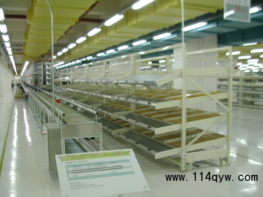 是將貨物置于滾輪上,利用一邊通道存貨,另一邊通道取貨。料架朝出貨方向向下傾斜,貨物在重力作用下向下滑動。