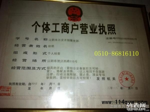 江陰萬靈開鎖中心位于江陰澄江西路115-5號。創(chuàng)辦于2010年,2012年已初具規(guī)模,由最初的2人發(fā)展為10人的團(tuán)隊。范圍江陰市各主要社區(qū)街道。具有雄厚的力量和強硬的開鎖技術(shù)服務(wù)于廣大客戶。江陰萬靈開鎖中心已與多家派出所、110、114、12580調(diào)度中心聯(lián)動開鎖。