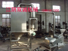 本機由加料斗、粉碎刀片、粉碎電機、出料口、風葉、集料箱、除塵箱、齒板等部分組成。物料由加料斗進入粉碎室,通過高速旋轉刀進行粉碎,調節篩網的細度達到所要求的物料細度,高速旋轉的風葉把達到要求的物料從粉碎室引到旋轉分離器出料,沒有達到要求的物料繼續在粉碎室中粉碎.粉塵吸入除塵箱回收利用.該機組按GMP標準設計上,結構簡單,操作清理方便,噪音小,產量高,機器全部用優質不銹鋼材料制作,粉碎過程中無粉塵飛揚。